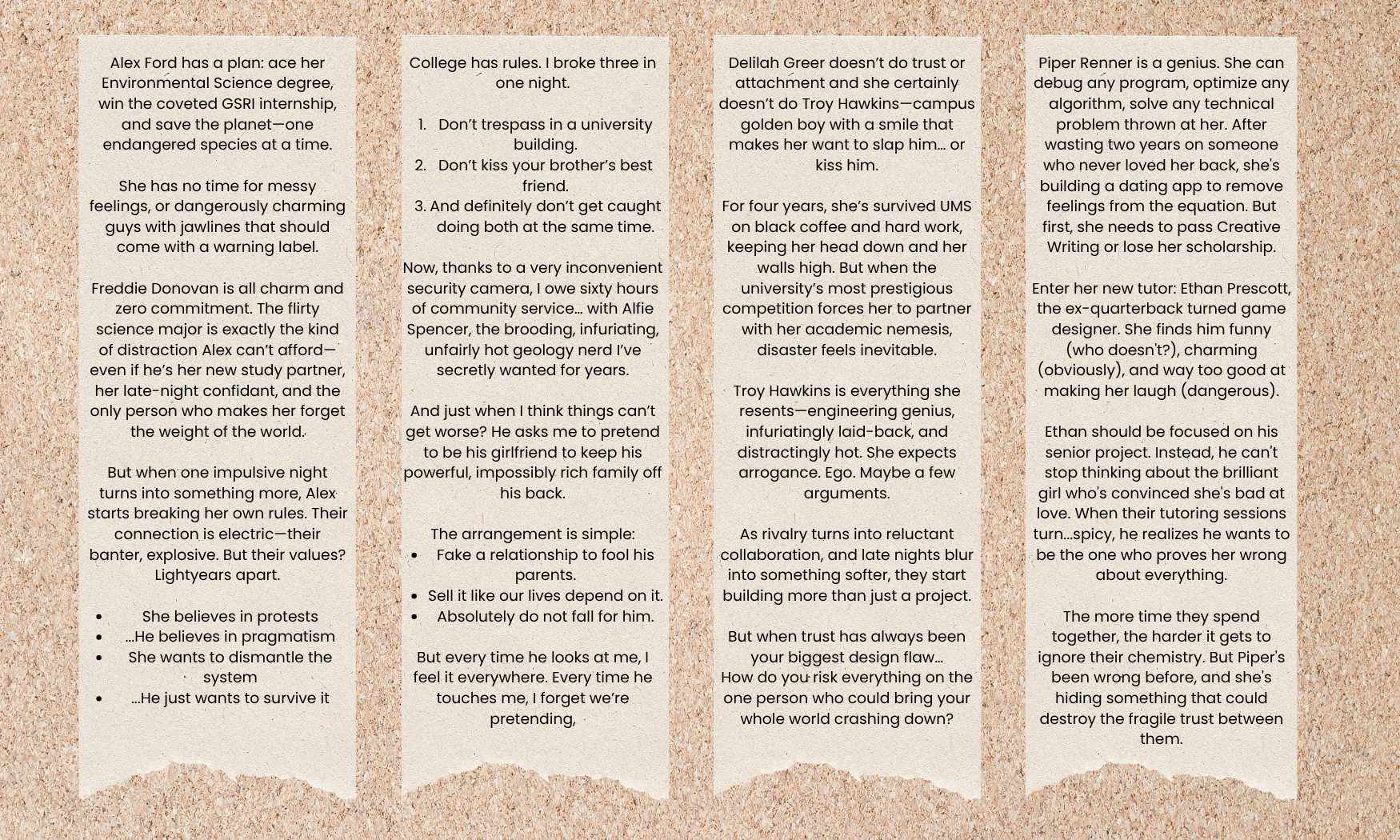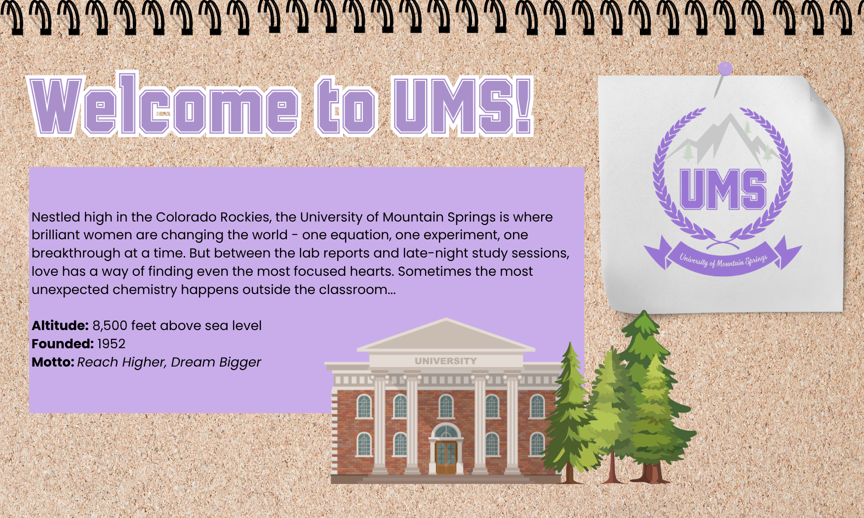 Welcome to University of Mountain Springs, where students make terrible romantic decisions, late-night tutoring gets steamy, and you’ll definitely laugh out loud (and…probably cry. Definitely cry.)